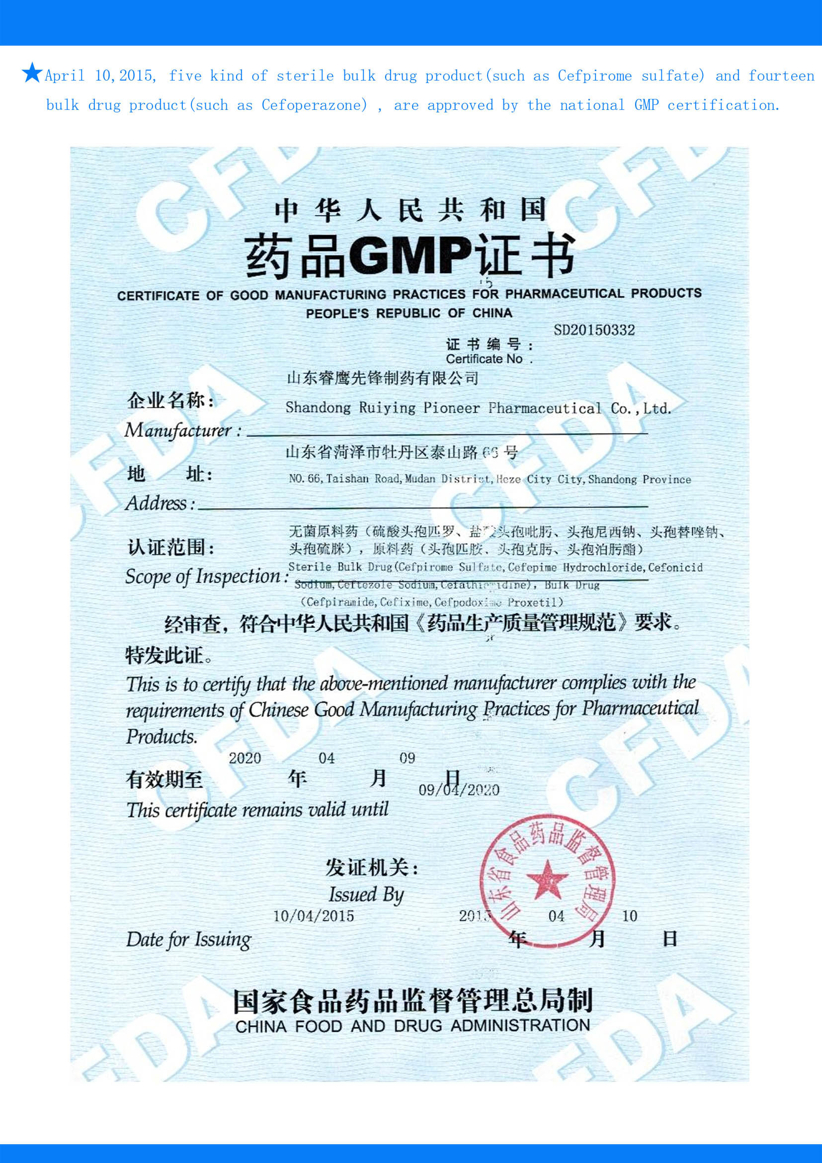Five kind of sterile bulk drug product and fourteen bulk drug product are approved by the national GMP certification