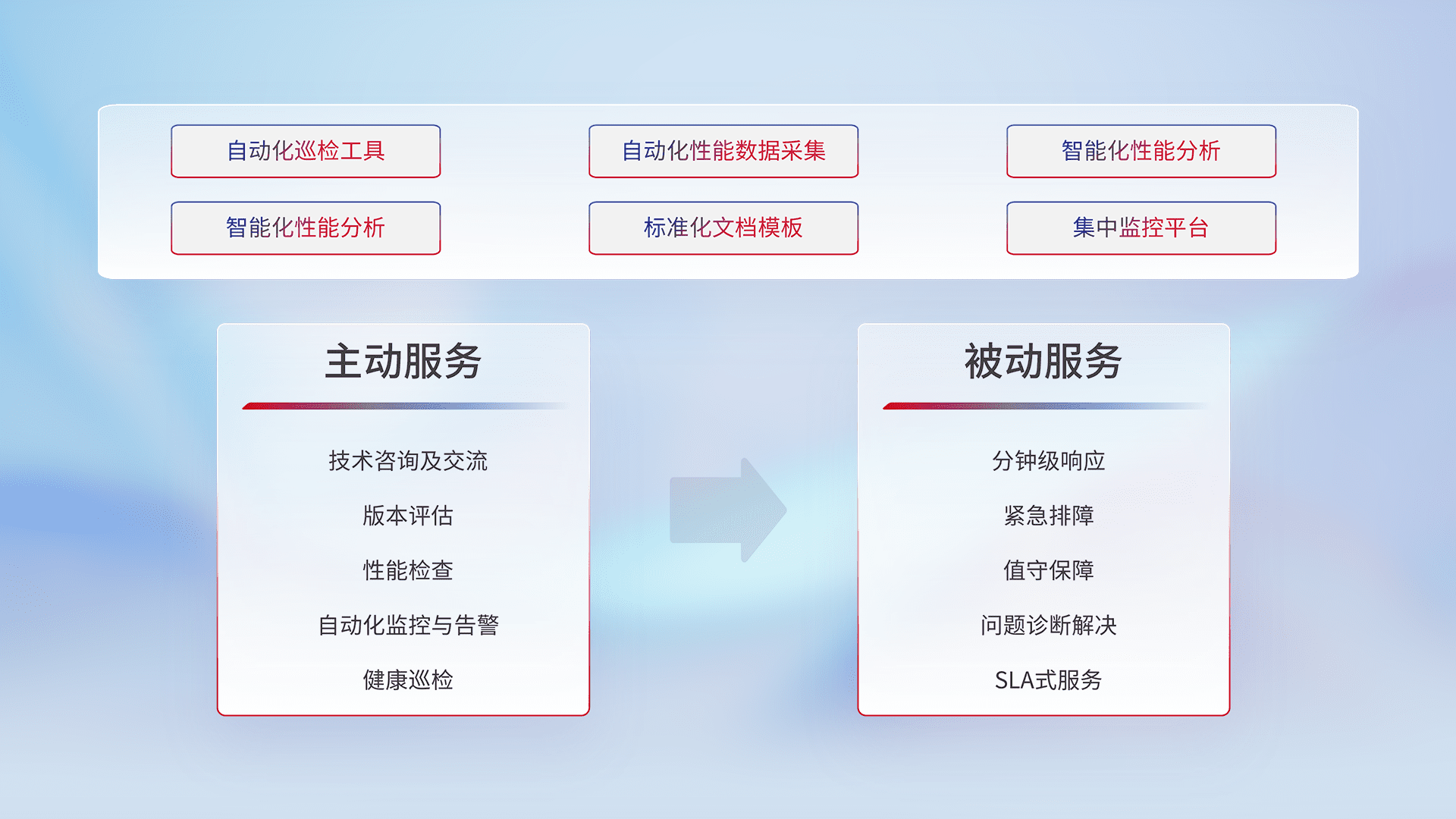 智能化工具和标准化文档,,,,保障服务质量,,提供主动服务(包含技术咨询、、版本评估、、、、性能检查、、、自动化监控与告警、、健康巡检)和被动服务包含(分钟级响应、、、紧急排障、、值守保障、、、、问题诊断解决、、SLA服务)。。。。